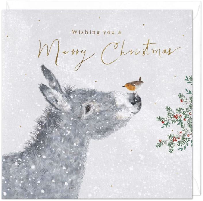 Donkey and Robin (XA237) Christmas card - message inside reads "Wishing you a Merry Christmas and a Happy New Year". Measures 158 x 158 mm - comes with white envelope.