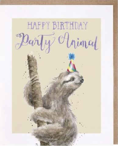 "Party Animal" birthday greeting card from Wrendale Designs featuring a partying sloth - 170 h x 138 mm - blank for your own message and comes with brown envelope.