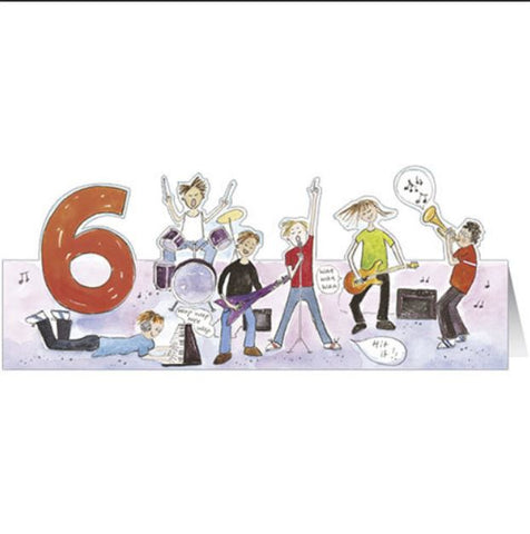 "Six" birthday cut-out greeting card from Flamingo. Blank inside for your own message. Comes with white envelope. Size: 90 x 210 mm