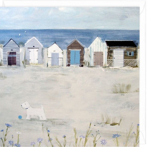"Beach Combing" greeting card - a Westie stands in front of beach huts - blank inside for your own message. Measures 158 x 158 mm - comes with white envelope.