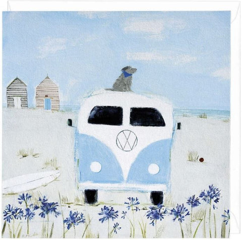 "Blue Camper"greeting card with dog seated on the roof of a blue camper van - blank inside for your own message. Measures 158 x 158 mm - comes with white envelope.