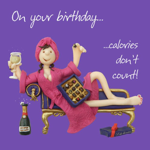 "Calories Don't Count" birthday greeting card from Holy Mackerel with artwork from the inimitable Erica Sturla. Blank inside for your own message. White envelope included. Size 150 x 150 mm