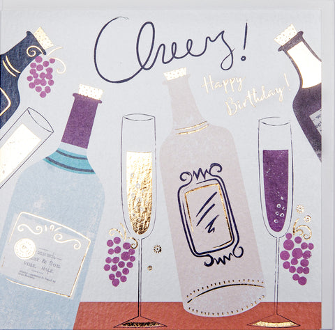 "Cheers! Happy Birthday" greeting card with vase of flowers - blank inside for your own message. Measures 158 x 158 mm - comes with grey envelope.