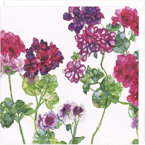 "Geraniums and Pelargoniums" greeting card - blank inside for your own message. Measures 158 x 158 mm - comes with grey envelope.