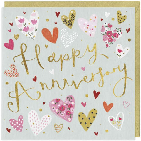 "Happy Anniversary" ditsy floral heart greetings card - blank inside for your own message. Measures 158 x 158 mm - comes with white envelope.
