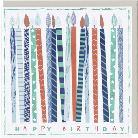 "Happy Birthday" greeting card with candles - blank inside for your own message. Measures 158 x 158 mm - comes with grey envelope.