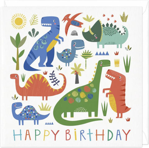"Happy Birthday" dinosaur themed children's birthday greeting card. Blank inside for your own message. Comes with white envelope. Size: 158 x 158 mm