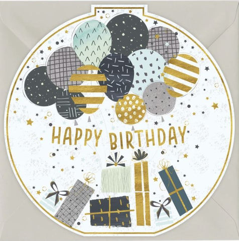 "Happy Birthday" circular greeting card with balloons and presents - blank inside for your own message. Measures 158 x 158 mm - comes with white envelope.