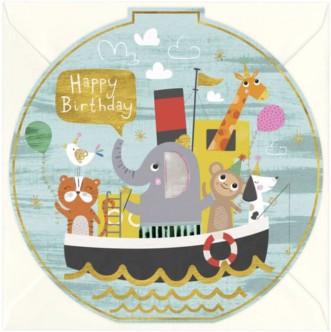 "Happy Birthday" children's birthday greetings card with elephant, giraffe, tiger and friends on a boat - blank inside for your own message. Measures 158 x 158 mm - comes with white envelope.