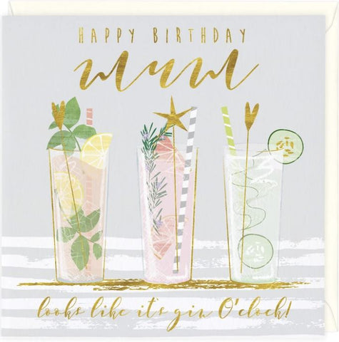 "Happy Birthday Mum....Looks Like It's Gin O'Clock" greeting card with G & T's - blank inside for your own message.....especially if your Mum loves a G&T. Measures 158 x 158 mm - comes with gold envelope.