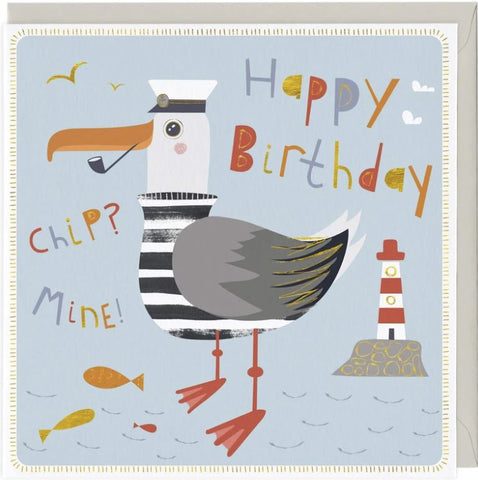 "Happy Birthday" Seagull greetings card - blank inside for your own message. Measures 158 x 158 mm - comes with grey envelope.