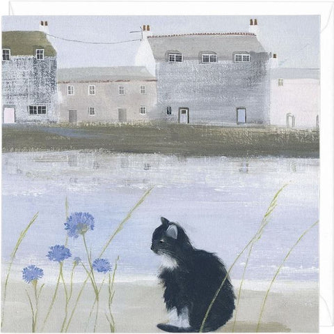 "Into the Blue" greeting card Featuring a black and white cat contemplating a harbour scene - blank inside for your own message. Measures 158 x 158 mm - comes with white envelope.