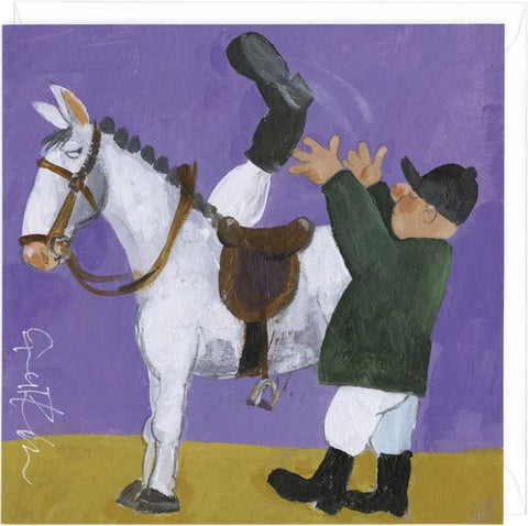 "Leg Over" greeting card featuring an over-exuberant groom "assisting" a rider while his disdainful mount looks on - blank inside for your own message. Measures 158 x 158 mm - comes with white envelope.