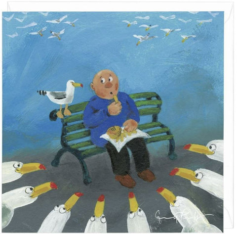 "Opportunists"greeting card with an anxious gentleman surrounded by marauding seagulls - blank inside for your own message. Measures 158 x 158 mm - comes with white envelope.