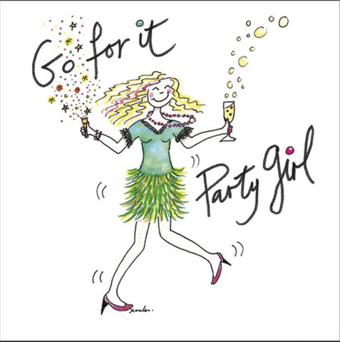 "Party Girl.... Go for it" greeting card from Flamingo. Blank inside for your own message. Comes with white envelope. Size: 128 x 128 mm