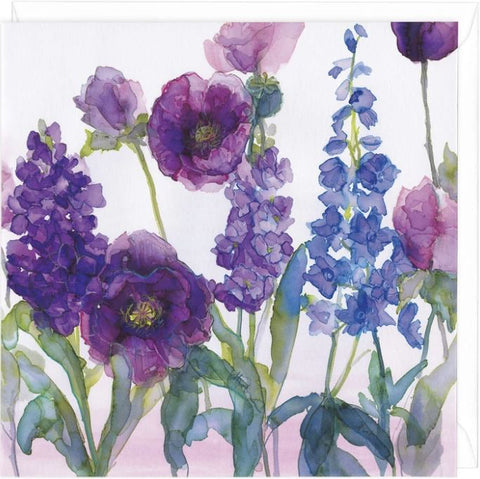 "Poppies and Delphiniums" greeting card - blank inside for your own message. Measures 158 x 158 mm - comes with white envelope.