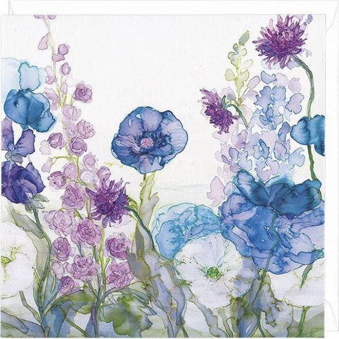 "Poppies, Delphiniums, Scabious & Sweet Peas" greeting card - blank inside for your own message. Measures 158 x 158 mm - comes with grey envelope.