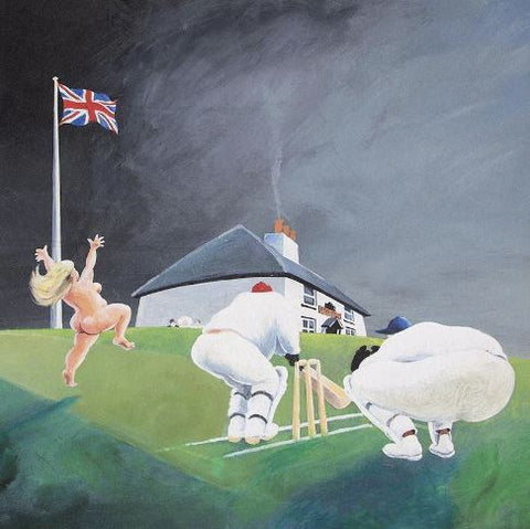 "Reasons to be Cheerful" greeting card : a batsman takes guard as a curvaceous female streaker runs across the cricket pitch - blank inside for your own message. Measures 158 x 158 mm - comes with white envelope.