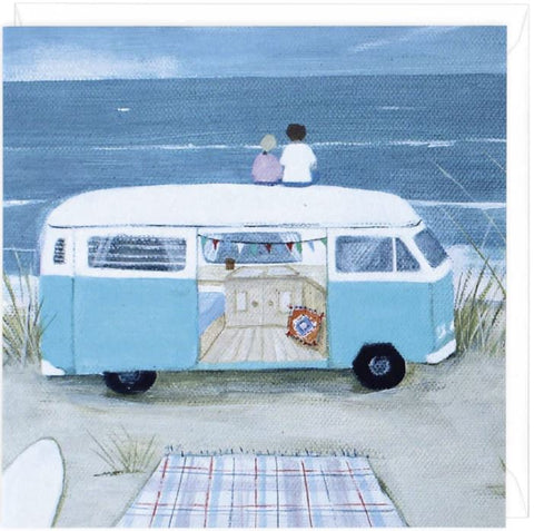 "Social Distancing" greeting card with a couple seated on the roof of a blue camper van - blank inside for your own message. Measures 158 x 158 mm - comes with white envelope.