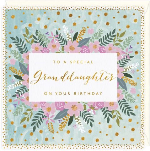 "To a Special Granddaughter on Your Birthday" card - blank inside for your own message. Measures 158 x 158 mm - comes with white envelope.