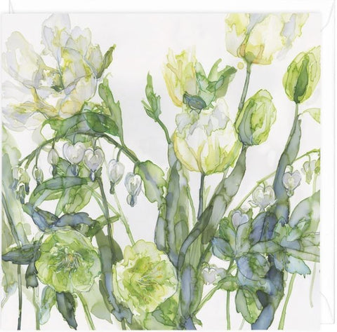 "Tulips and Hellebore" greeting card - blank inside for your own message. Measures 158 x 158 mm - comes with white envelope.