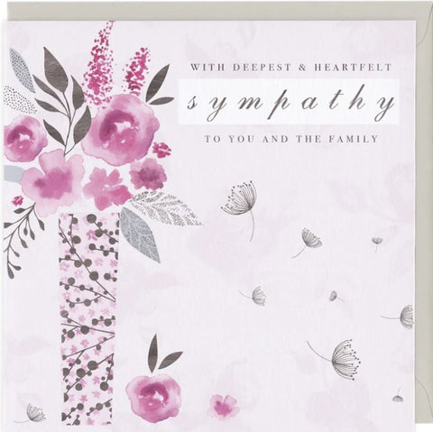 "With Deepest & Heartfelt Sympathy to You and the Family' card - blank inside for your own message. Measures 158 x 158 mm - comes with grey envelope.