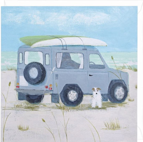 "Big Adventures" greeting card - a happy dog by a Land Rover bearing surf-boards -blank inside for your own message. Measures 158 x 158 mm - comes with white envelope.