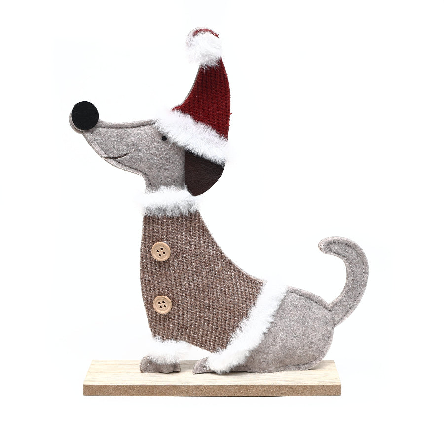 If you want a 'top dog' centrepiece for your Christmas display, this has got to be it! This beautiful sausage dog is crafted from felt with a natty glittering corded waistcoat with buttons and corded Santa hat, while the whole immaculate outfit is neatly set off with fluffy white ruffs. Our proud pooch sits on a wood veneered plinth and from every angle is absolutely adorable. He measures approximately 27.5 cm. tall x 23 cm. wide. His body is approximately 2 cm. deep (and at £8.50, we think he's a steal!).