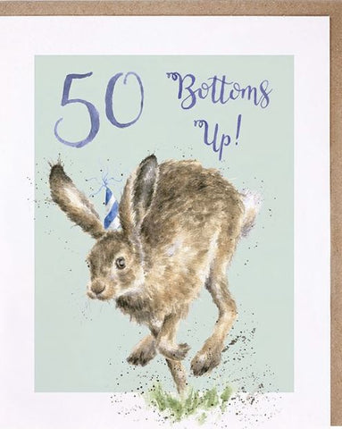 "50 Bottoms Up" birthday greeting card from Wrendale Designs featuring a running hare with party hat - 170 x 140 mm - blank for your own message and comes with brown envelope.