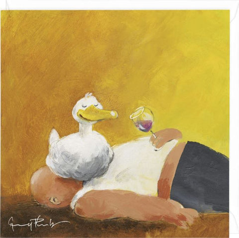 "A Sitting Duck" greeting card with a contented duck sitting on the prostrate body of an overly indulgent wine drinker - blank inside for your own message. Measures 158 x 158 mm - comes with white envelope.