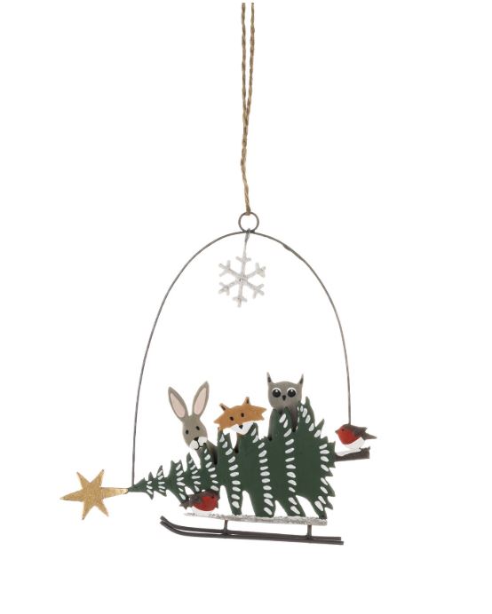An owl, fox and rabbit watched by two robins have mounted their tree on a sled to take home for Christmas. Another great hanging Christmas decoration from Shoeless Joe, it is made of hand painted metal and measures H12 x W10 x D1 cm. approximately.