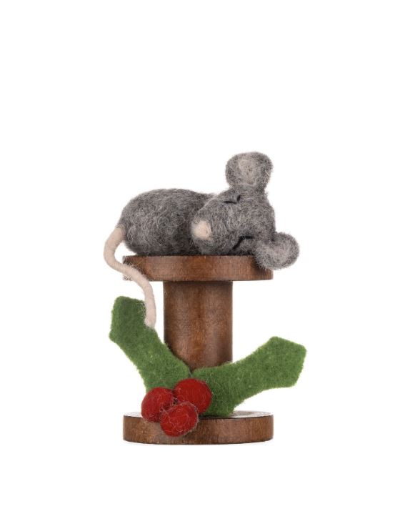 Isn't this the cutest Christmas decoration? A little mouse takes a nap on top of a bobbin decorated with a holly sprig. This irresistible seasonal ornament from Shoeless Joe is made of felt and wood and measures H 9 x W 7 x D 5 cm. approximately.