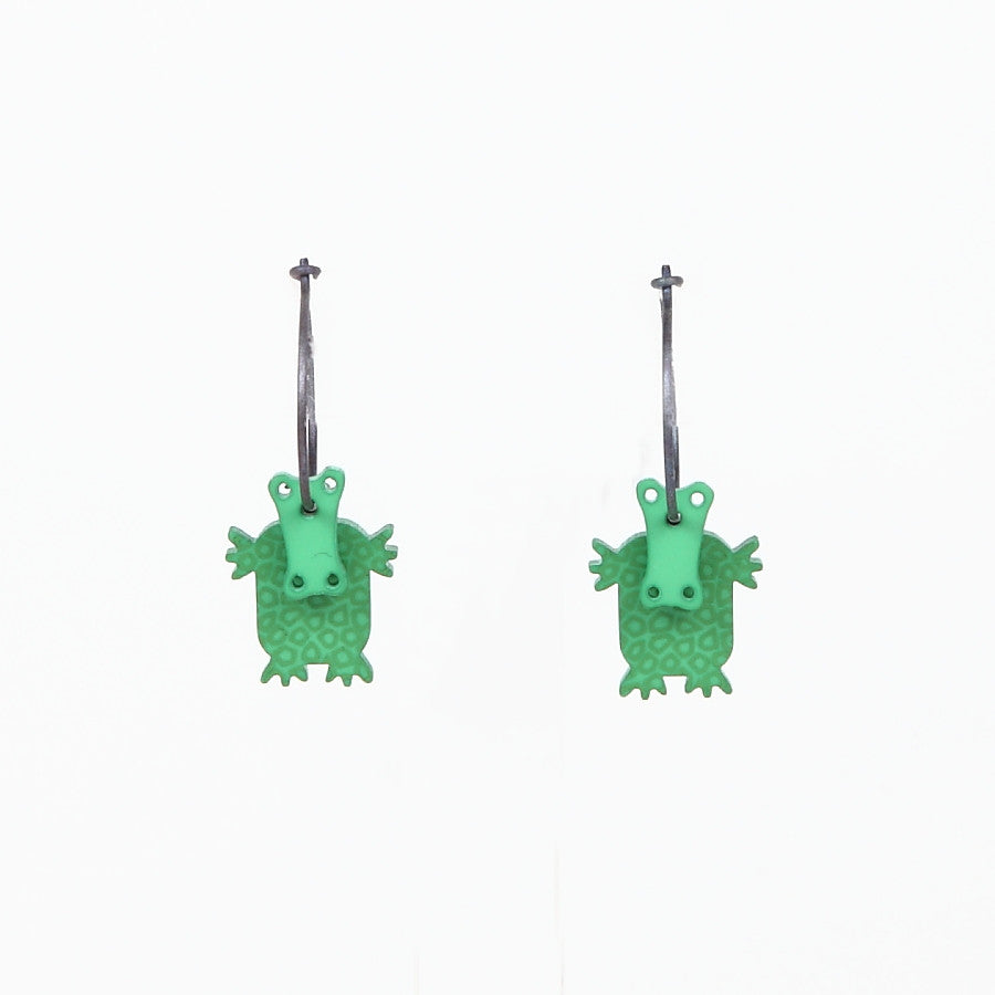Quirky earrings from Danish company 'Lene Lundberg'. They comprise a titanium hypo-allergenic hoop and a delicate cut-out in a form of acrylic. The earrings come in a host of colours and animals, birds and insects.....this particular pair are scary crocodiles. They hang nicely and jiggle beautifully whilst being worn.