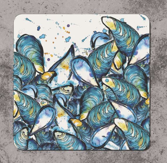 Dollyhotdog coasters are handmade in the UK with a sustainably sourced Eucalyptus board base, a matt finish melamine surface with a black baize backing. This one features a beautiful Mussels design and measures 100 x 100 mm.
