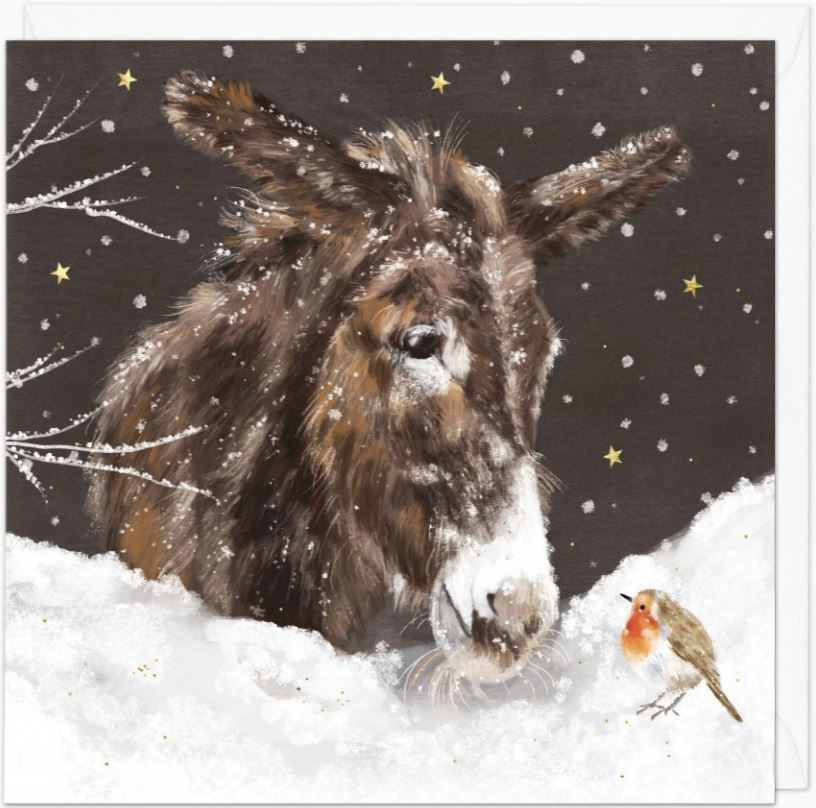 Donkey and Robin in the Snow  (XA265) Christmas Card - message inside reads "Wishing you a Merry Christmas and a Happy New Year". Measures 158 x 158 mm - comes with white envelope.