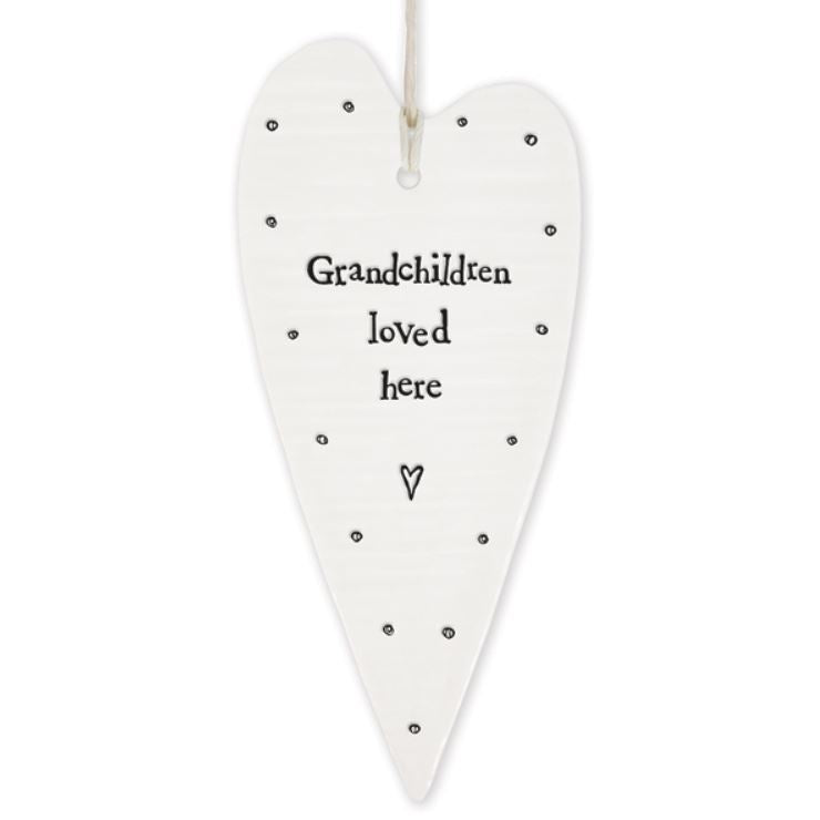 Beautiful white ceramic heart from East of India with lovely sentiment 'Grandchildren Loved Here.' makes a perfect little gift. Size: 13 x 6 cm