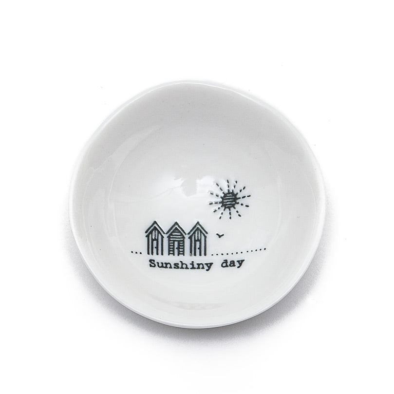 Pretty little porcelain dish from East of India with 'Sunshiny Day' message, perfect for the dressing table, bedside table or even in the kitchen or hallway. Great gift idea! Diameter is 6.5 cm.