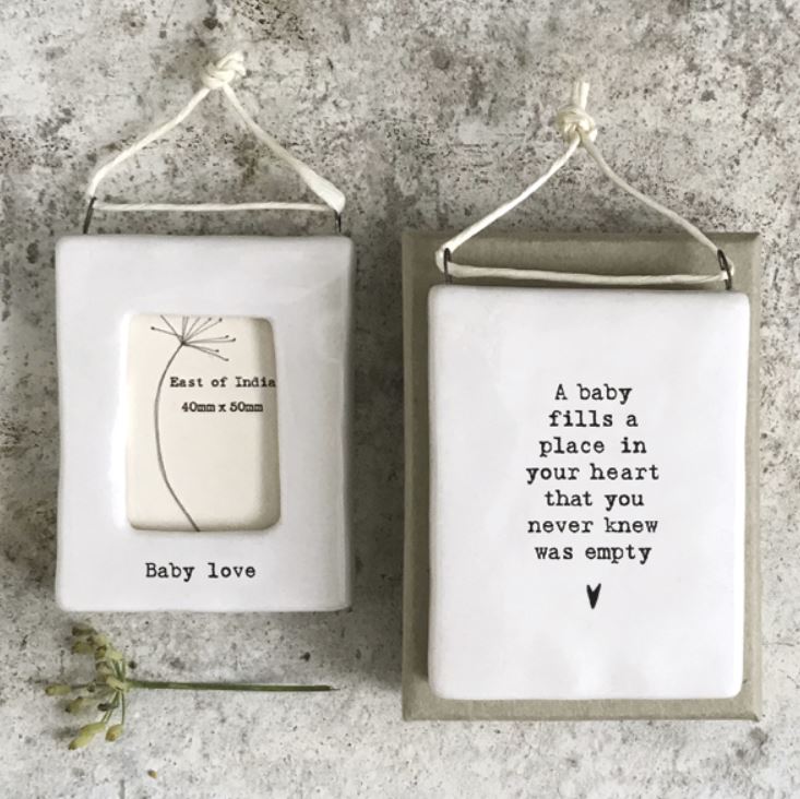 Perfect little white ceramic hanging frame from East of India with delightful 'Baby Love' message. What better way of celebrating the new arrival or remembering the little one when they are not so little? You can insert your chosen photo via a slot in the top. Size approx.: 6 x 4.8 cm