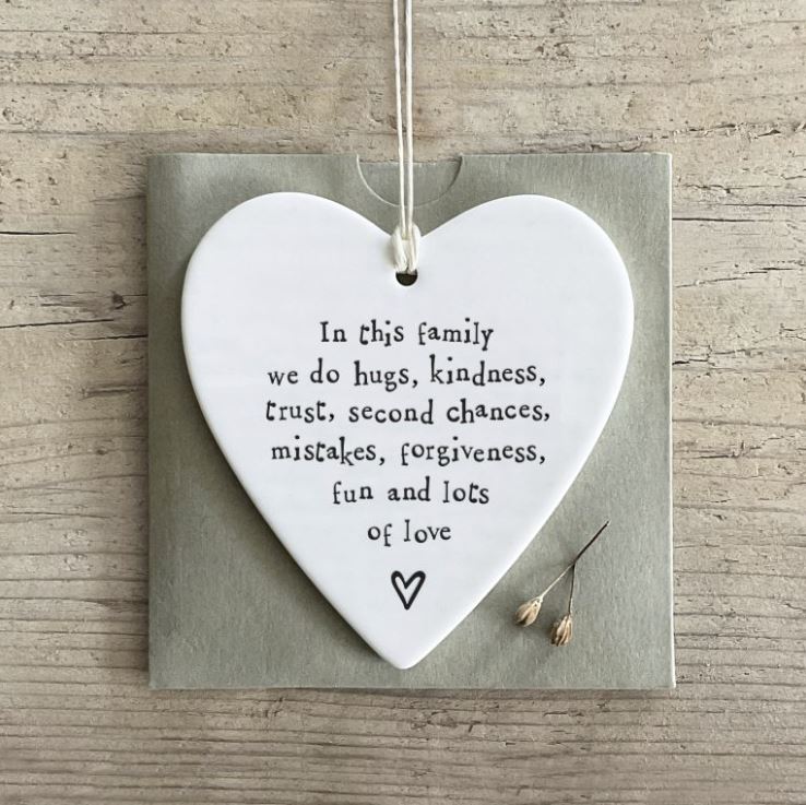 Gorgeous and delicate creamy white ceramic heart from East of India with pretty drawing and sentimental thought: ' In this family.....'. Perfect little gift for any occasion. Size approx 9 x 9 cm.