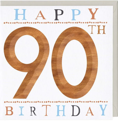 "Happy 90th Birthday" greetings card - blank inside for your own message. Measures 158 x 158 mm - comes with grey envelope.