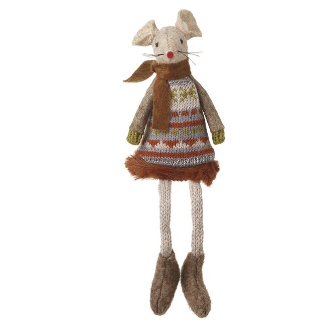 Adorable fabric mouse decoration. She sports a Scandinavian style knitted woollen dress with brown furry fringe, with a felt scarf and matching booties. Her pliable legs mean she can be sat at the centre of your Christmas display. She measures approximately 17 cm in height.