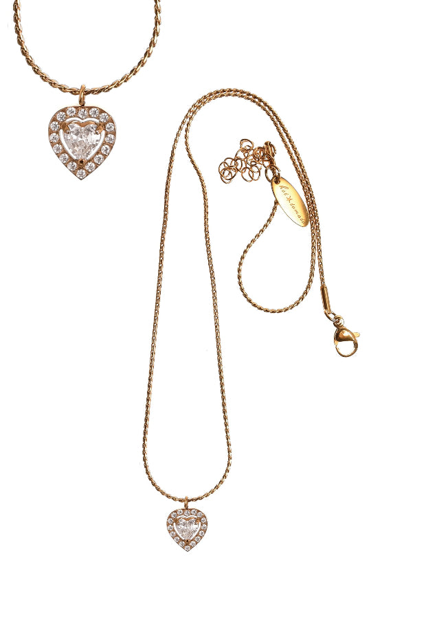 Delicate serpentine-style chain in gold plated stainless steel, with a gorgeous crystal heart at its centre. The heart has a central larger heart shaped crystal surrounded by tiny crystals. Understated and elegant - can be worn every day or as an elegant accessory to a special dress. Chain measures approximately 43 cm with a 5 cm extender.