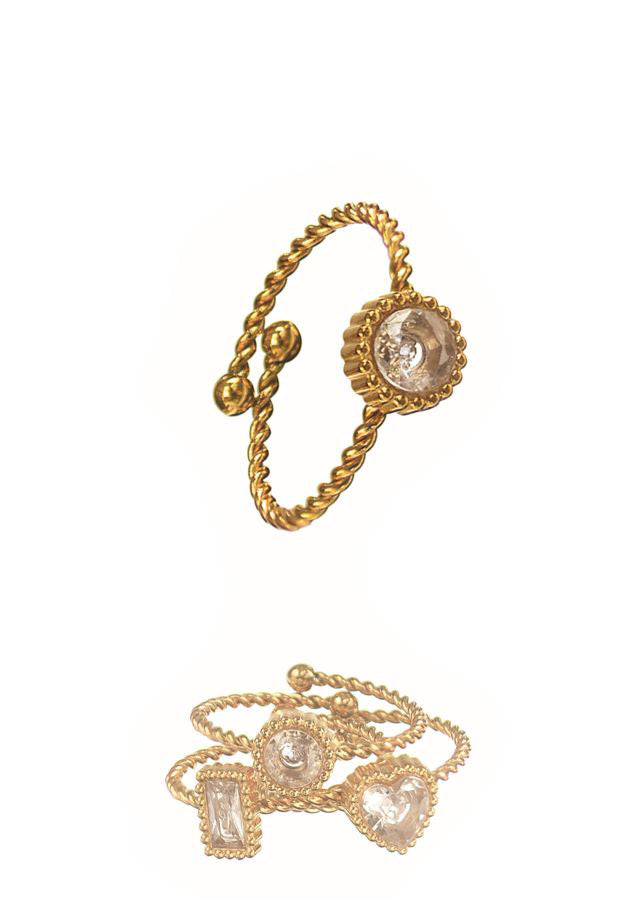 Dainty, stackable, fully adjustable ring with round clear crystal. Also available with emerald green crystal. Both colours also come with a rectangle crystal. The rings are made of stainless steel with 18k gold plating. This makes them far more tarnish-resistant.