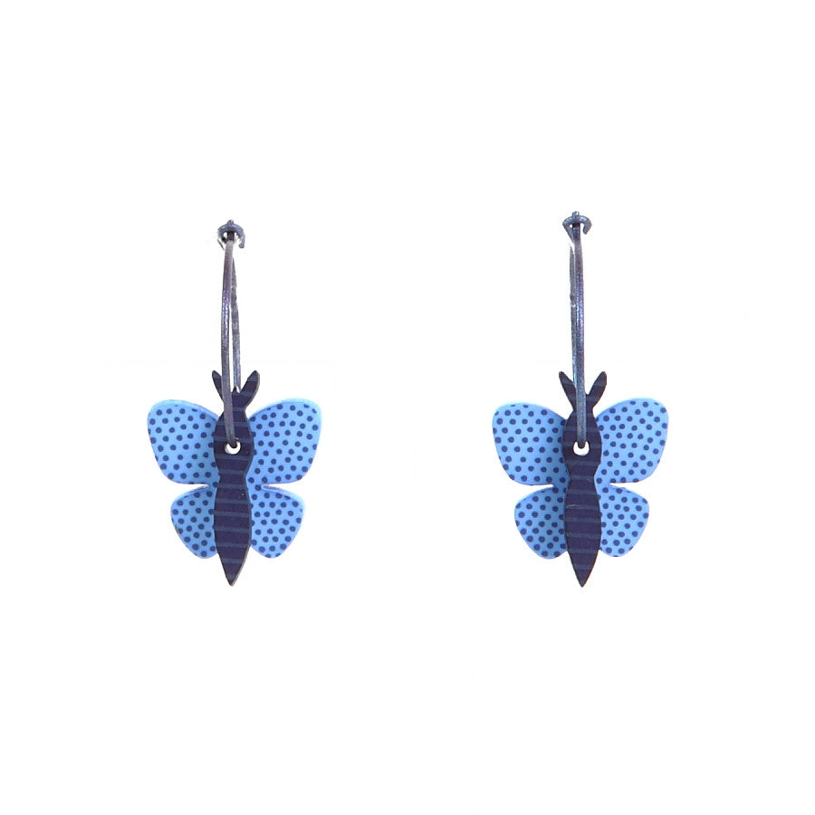 Quirky earrings from Danish company 'Lene Lundberg'. They comprise a titanium hypo-allergenic hoop and a delicate cut-out in a form of acrylic. The earrings come in a host of colours and animals, birds and insects.....this particular pair are pretty blue butterflies. Colours may vary slightly. They hang nicely and jiggle beautifully whilst being worn.