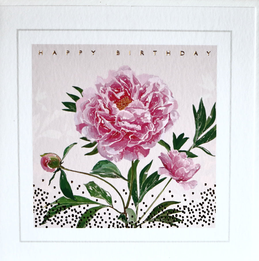 Peony Happy Birthday card - blank inside for your own message. Measures 158 x 158 mm - comes with white envelope.