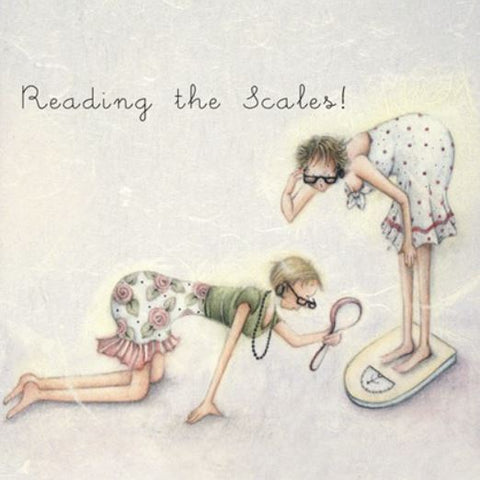 "Reading the Scales!" greeting card from Berni Parker. Blank inside for your own message. White envelope included. Size 150 x 150 mm