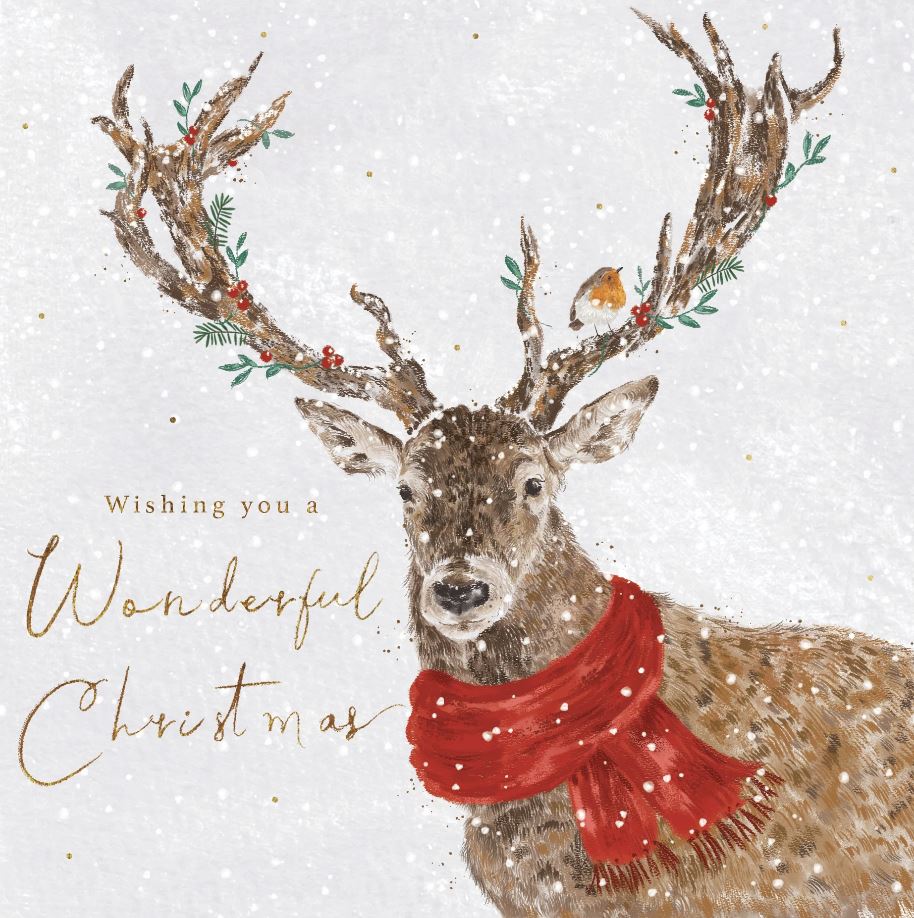 Robin in the Antlers (XA236) Christmas Card - message inside reads "Wishing you a Merry Christmas and a Happy New Year". Measures 158 x 158 mm - comes with white envelope.