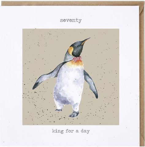 "Seventy.... King for a Day" birthday greeting card from Wrendale Designs with a proud King Penguin - 158 x 158 mm - blank for your own message and comes with brown envelope.