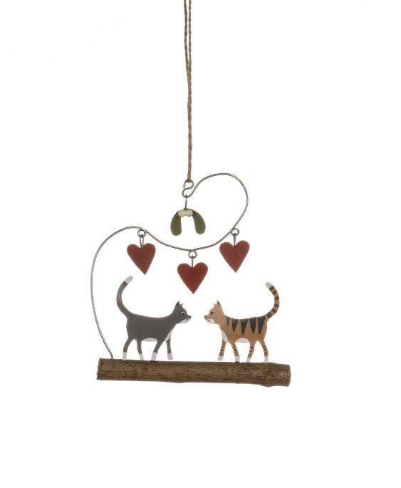 A loving feline couple prepare to embrace under a canopy of three red hearts and a mistletoe sprig in this delightful Christmas decoration from Shoeless Joe. Made of hand painted metal with a string hanger, it measures approximately H 11 x W 11 x 1 cm.