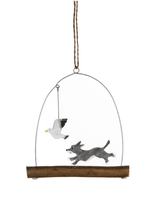 A grey dog merrily chases a seagull in this humorous scene from Shoeless Joe. The delightful hanging decoration is made of hand painted metal and wood and measures approximately H 11 x W 11 x D 1 cm.